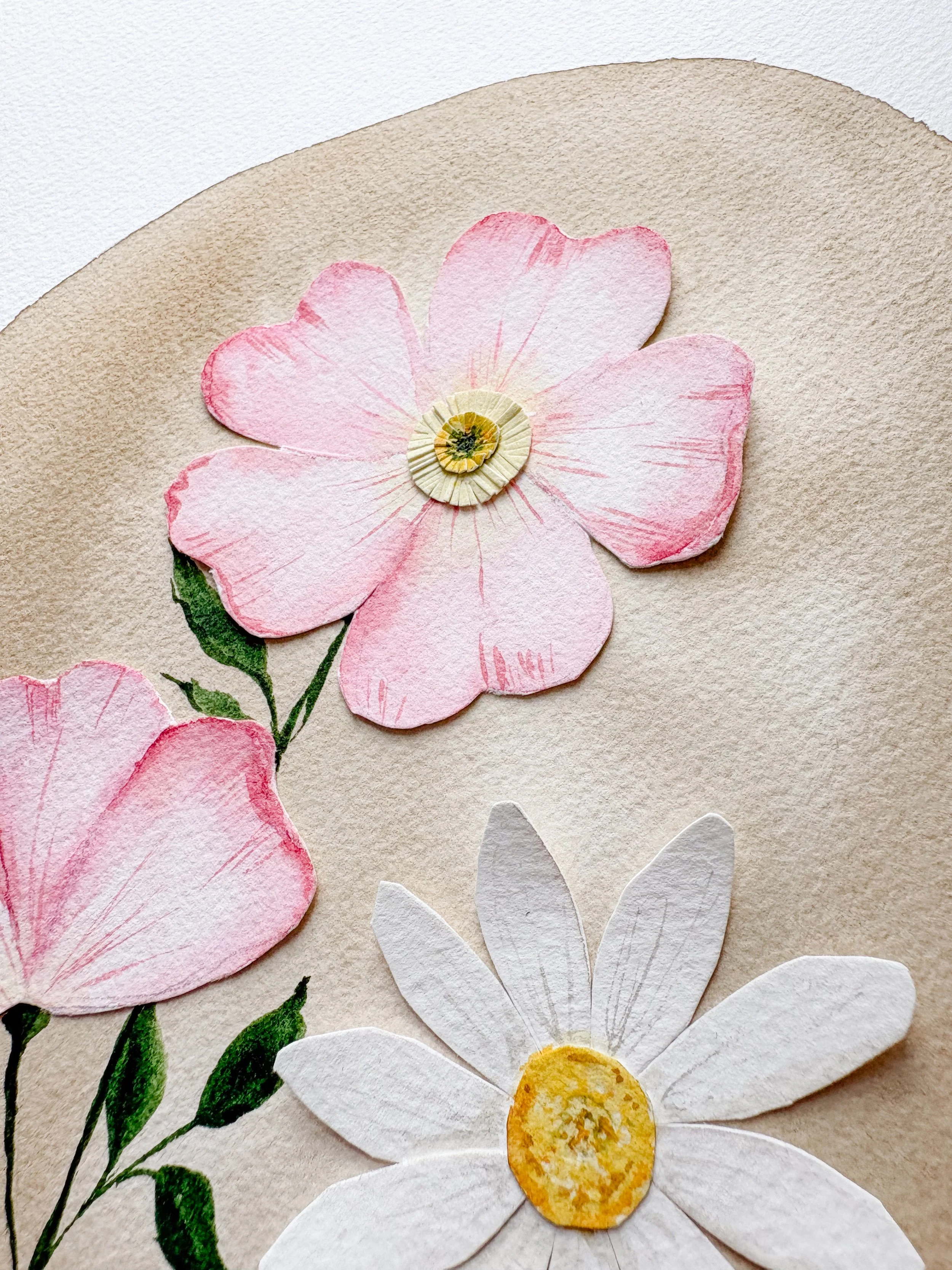 Every piece starts with watercolor and ends with a lot of tiny scissors. In between - pressing, cutting, layering, and a fair amount of holding-my-breath while placing a single petal exactly where it needs to go. Worth it every time. ✨