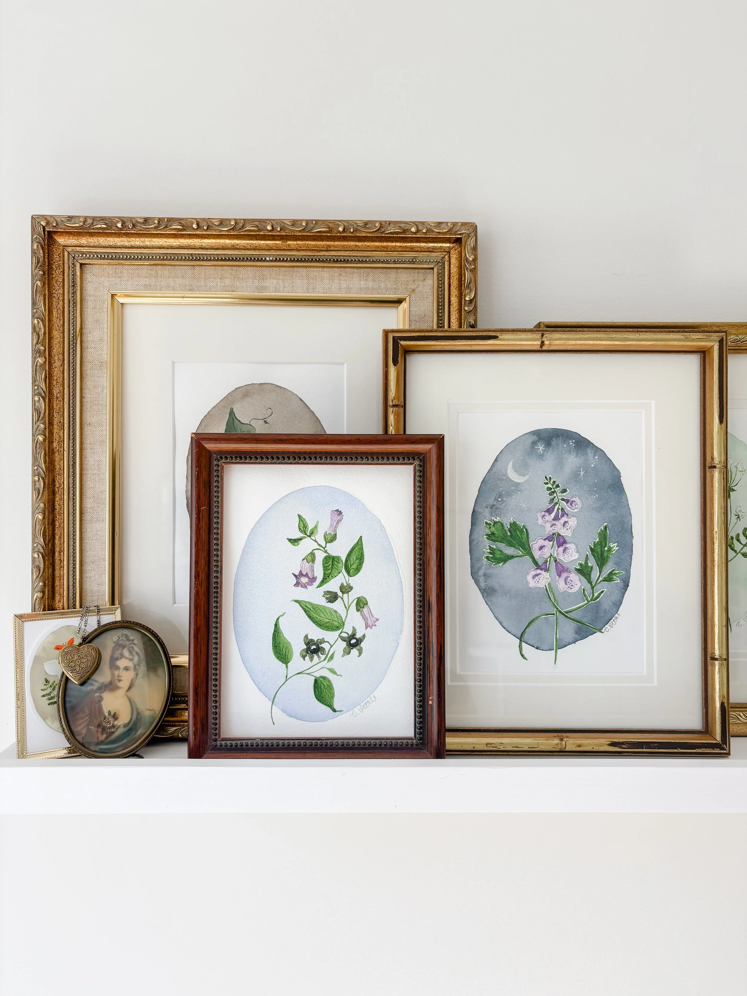You’ve stumbled into The Witch’s Garden: a collection of one-of-a-kind watercolor paintings, each cradled in a vintage frame as unique as the plants themselves.