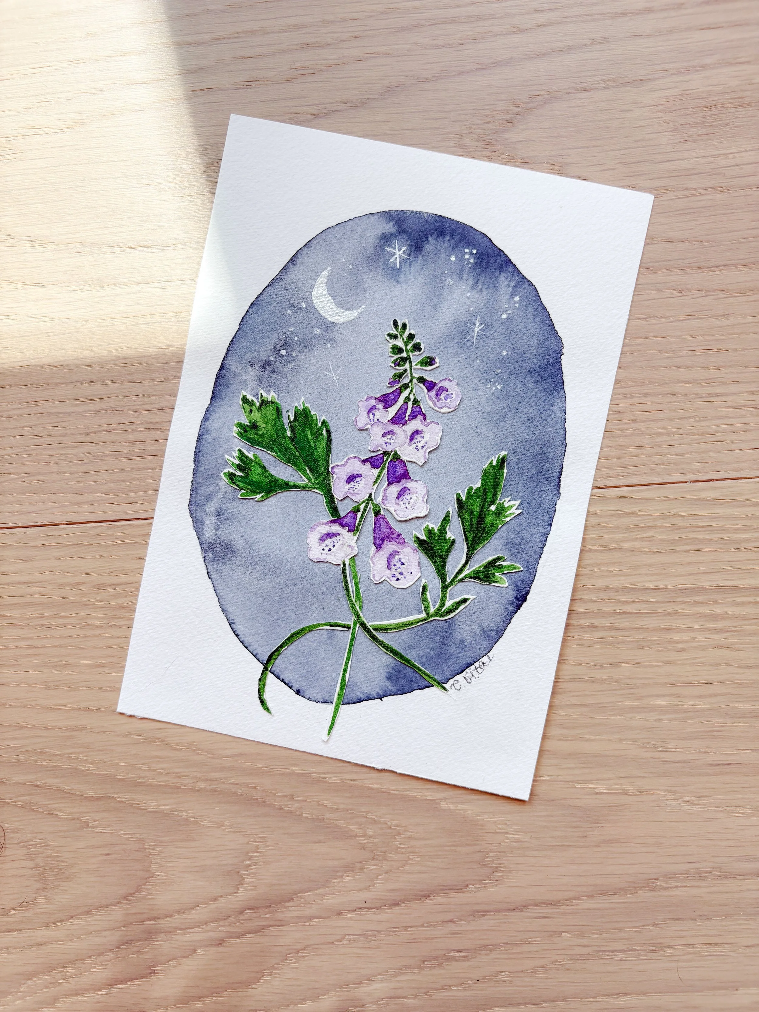This mixed media variation brings new texture to an intriguing pairing. In Foxglove & Mugwort (Collage Edition), painted elements meet paper fragments, layering stories and sensations into a dreamy 5×7 composition.