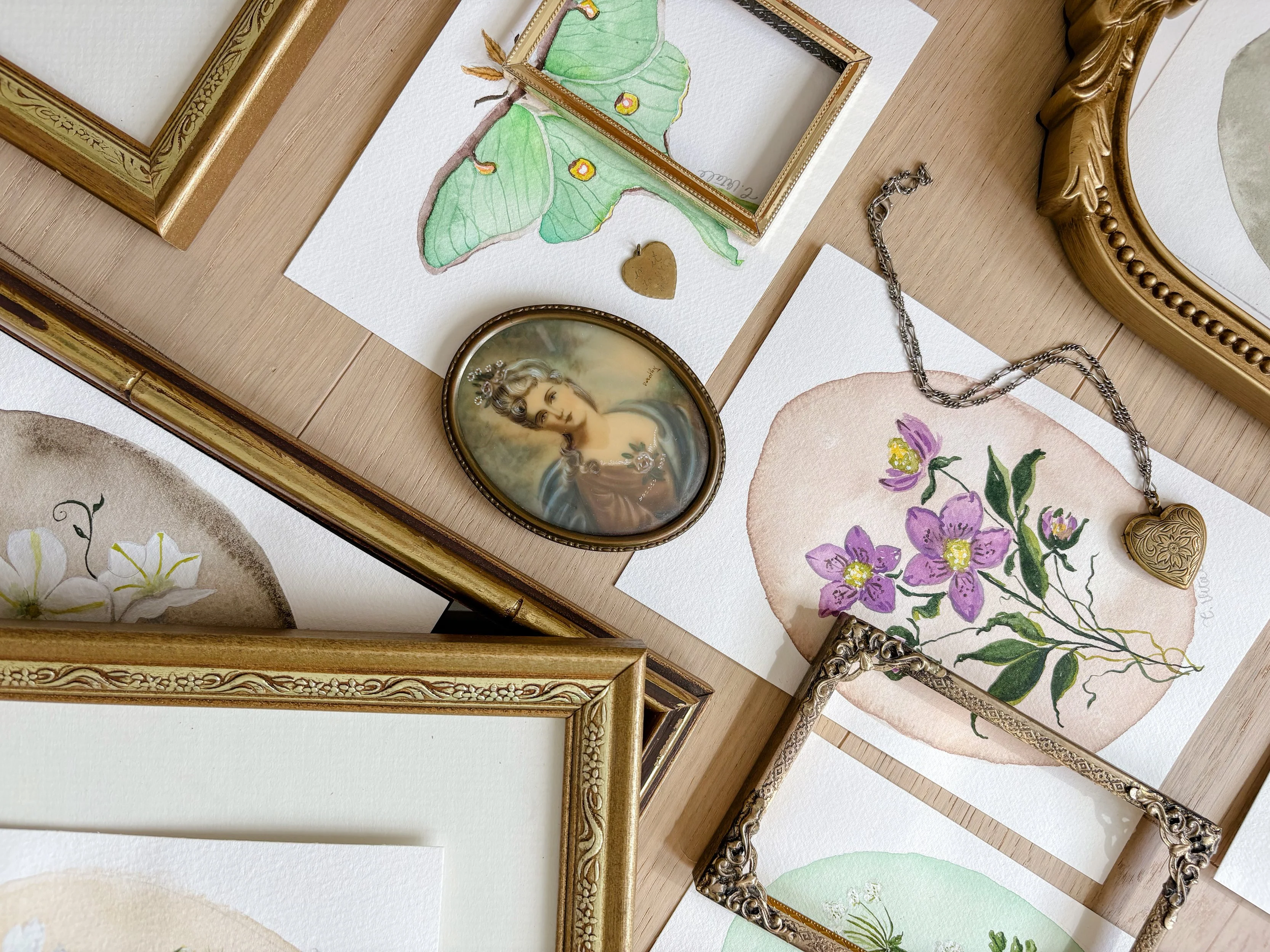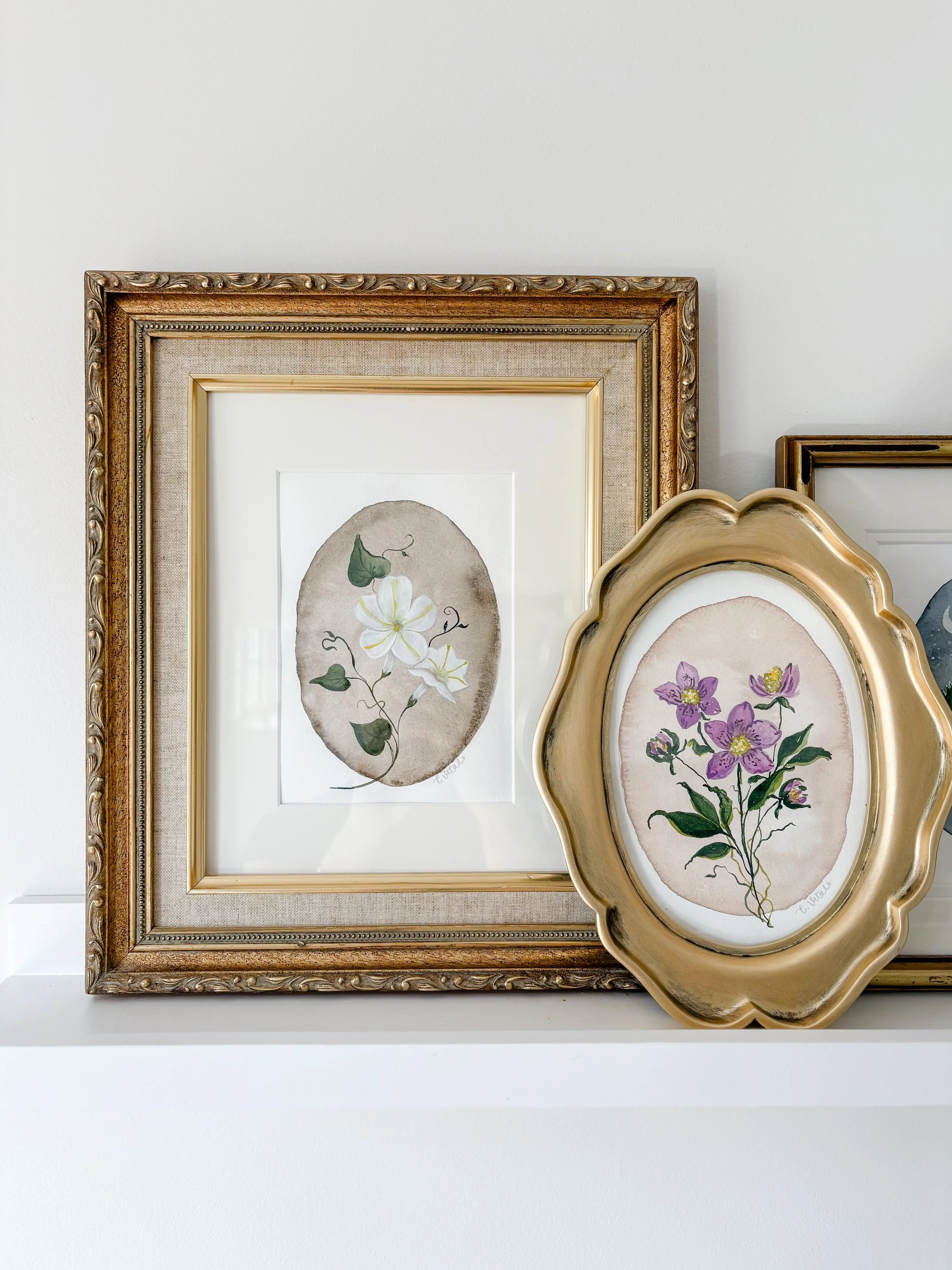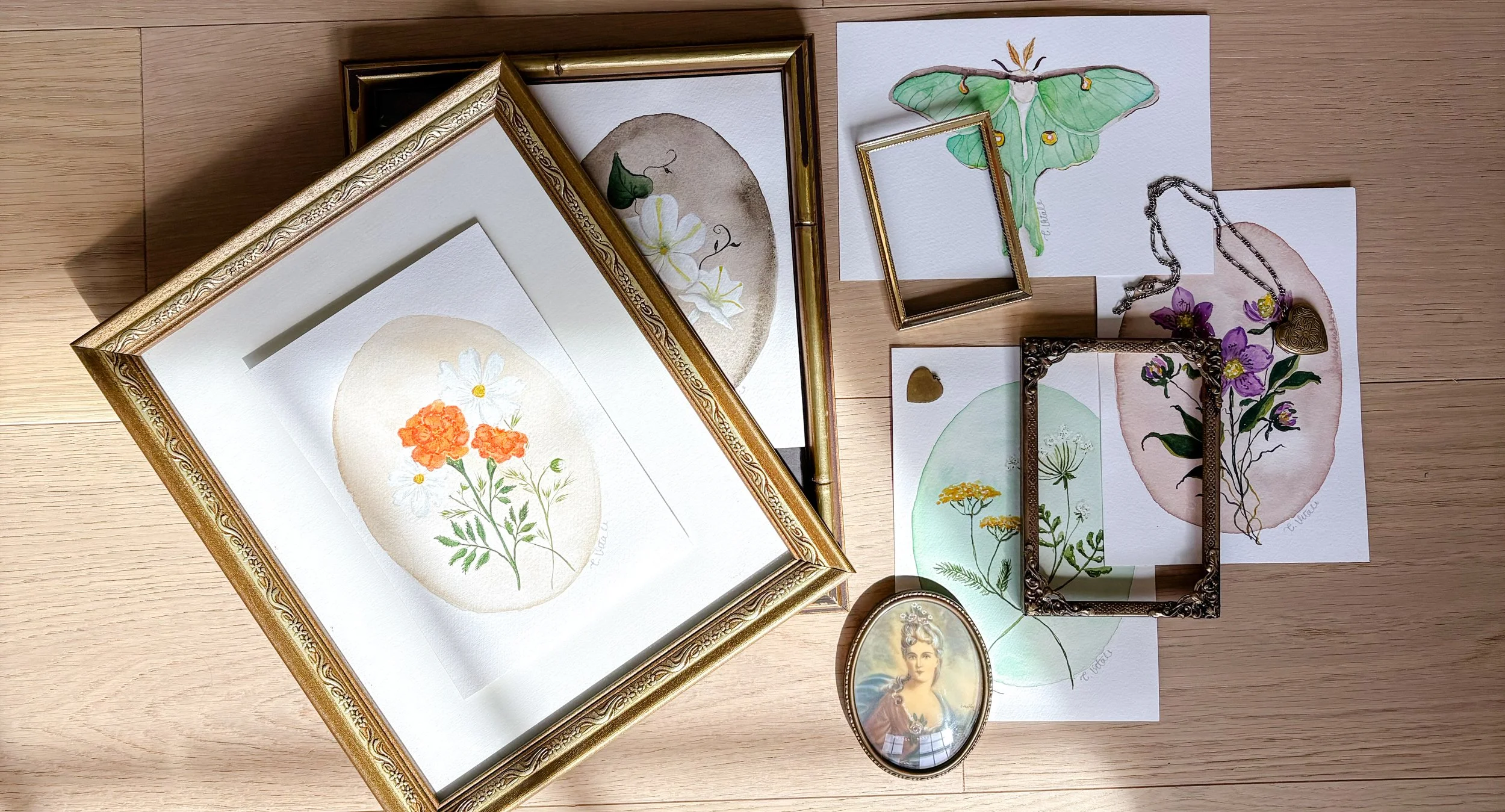 Inspired by antique lockets, secret gardens, and the thrill of peeking through a keyhole, these pieces feel like treasures you might discover tucked away in a curiosity cabinet or spellbook. Painted in watercolor “cameo” style - oval frames on soft washes of color - they hold the quiet magic of botanical folklore, brought to life in miniature worlds.